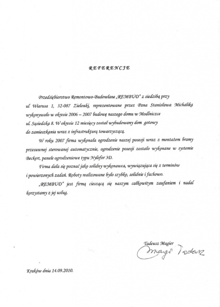 Opis wykonanych prac: Generalne wykonawstwo domu jednorodzinnego wraz z infrastrukturą towarzyszącą. Wykonanie ogrodzenia posesji wraz z montażem bramy przesuwnej sterowanej automatycznie. Dom został wybudowany w ciągu 12 miesięcy do stanu „pod klucz”. Wysoki standard wykończenia obejmował wyposażenie wnętrz oraz zagospodarowanie działki z urządzeniem ogrodu.
