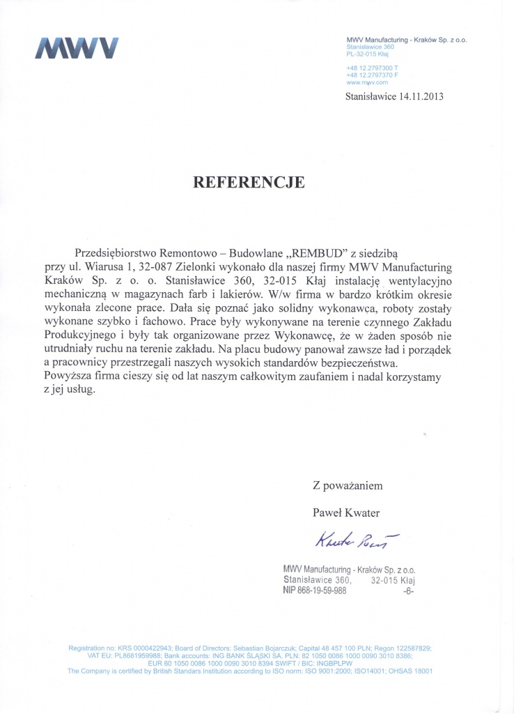 Opis wykonanych prac: Wykonanie klimatyzacji hali produkcyjnej o kubaturze 14 000m3 oraz wentylacji mechanicznej pomieszczenia prasowania odpadów o kubaturze ok. 1 200m3. Prace wykonywane na terenie czynnego Zakładu Produkcyjnego.